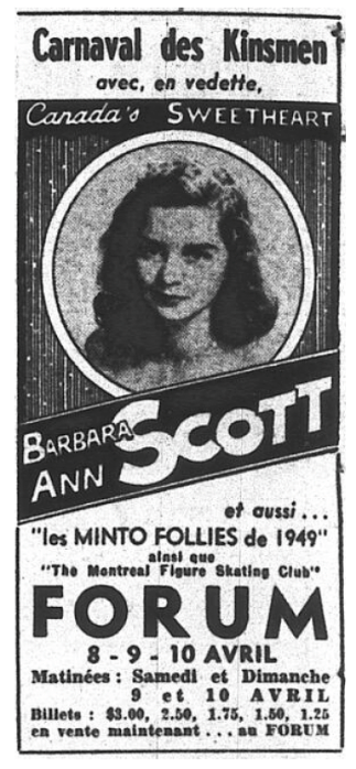 Les Carnavals étaient avant tout des revues présentées par des clubs. Au printemps 1948, le Kinsmen’s Carnival a pris d’assaut le Forum du 8 au 10 avril. Ce spectacle a rassemblé des patineurs de renom ainsi que les membres du club Minto d’Ottawa et du Montreal Figure Skating Club. À l’époque, seuls les patineurs qui avaient excellé en compétition avaient le privilège de présenter un numéro en solo. Le club Minto avait l’honneur de présenter la star de l’heure, Barbara Ann Scott.