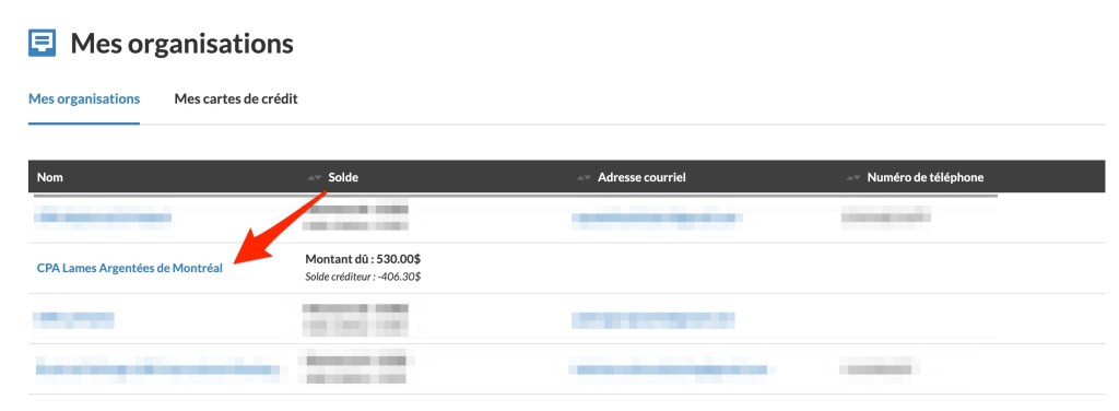Si vous avez utilisé Sportnroll avec plusieurs organisme, vous aurez une liste de ces organismes ici. Trouvez le CPA Lames Argentées de Montréal dans la liste et cliquez.