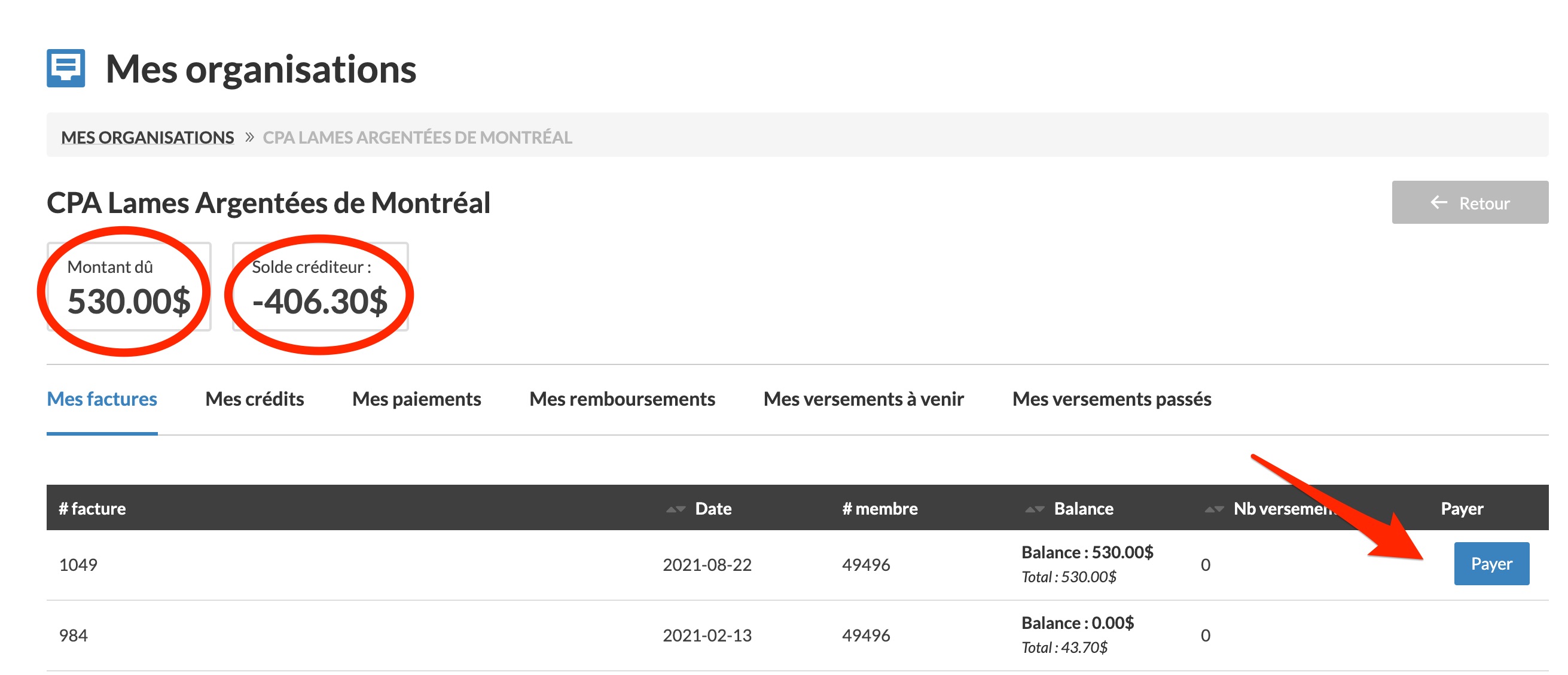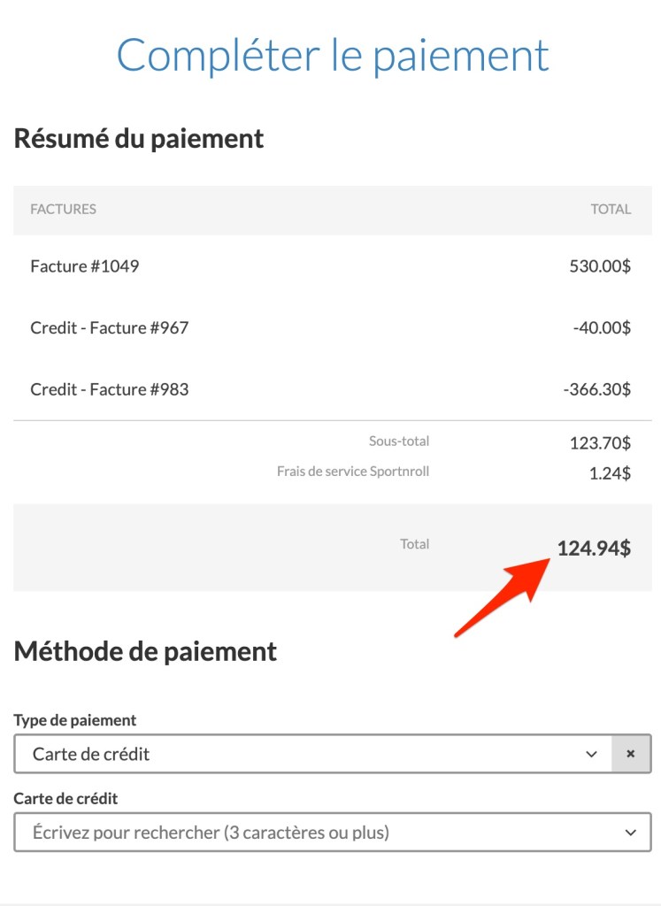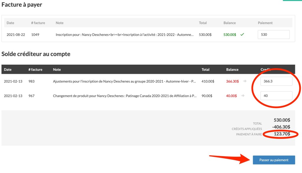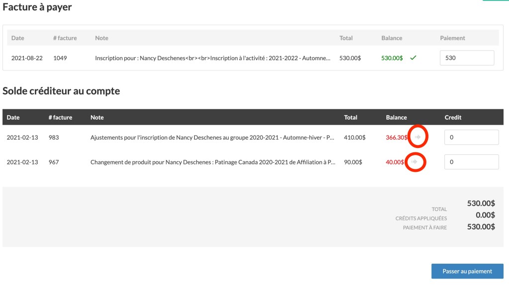 Cliquez le bouton « Payer ». Les crédits disponibles sont présentés sur la facture. Pour les appliquer, il faut utiliser la toute petite flèche à côté des montants des crédits