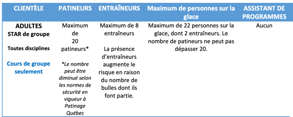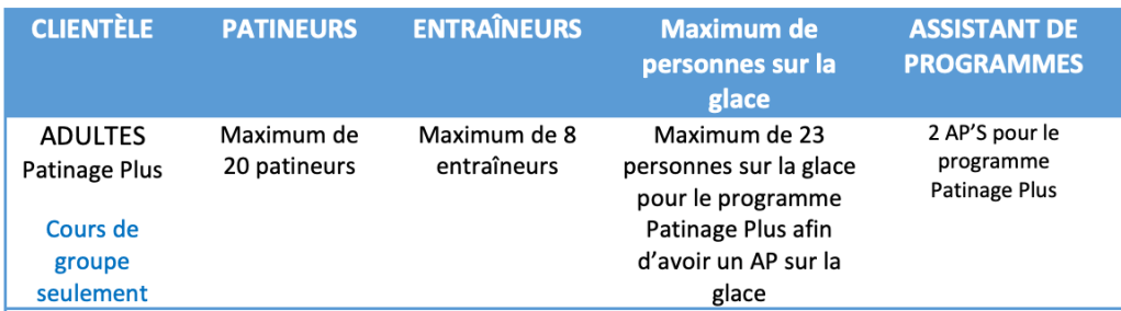 Voici les tableaux des limites de patineurs sur la glace pour la saison 2020-2021 émis par Patinage Québec.