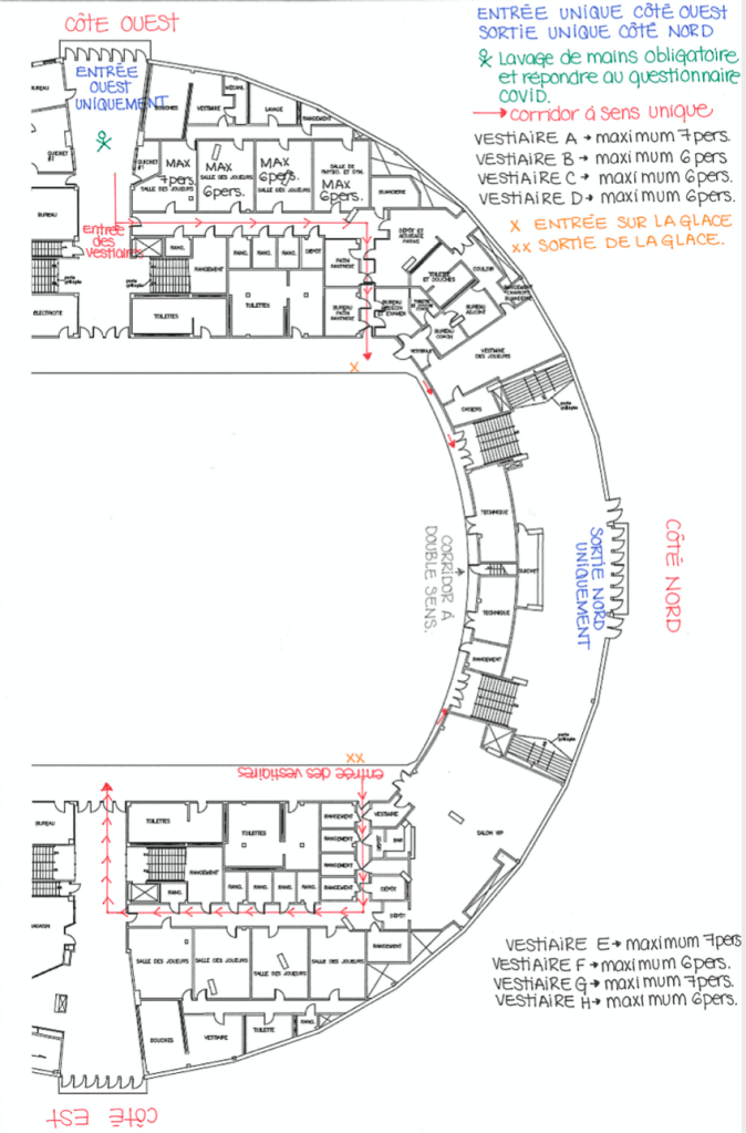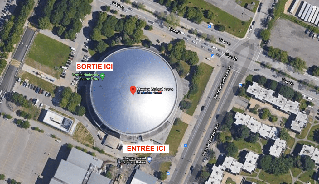 Entrées et sortie de l’aréna Maurice Richard. Notez, que nous avons accès au VESTIAIRE A seulement